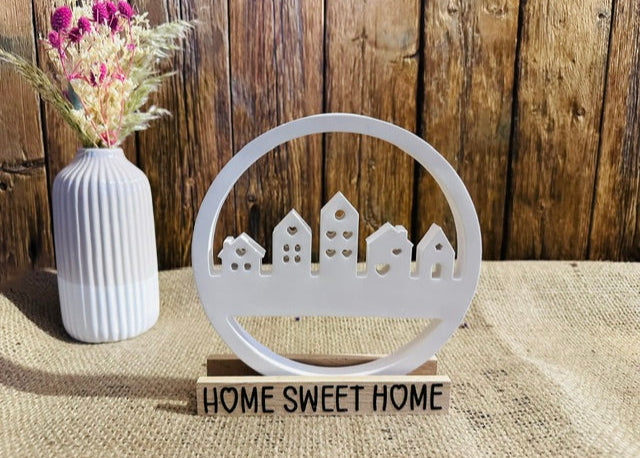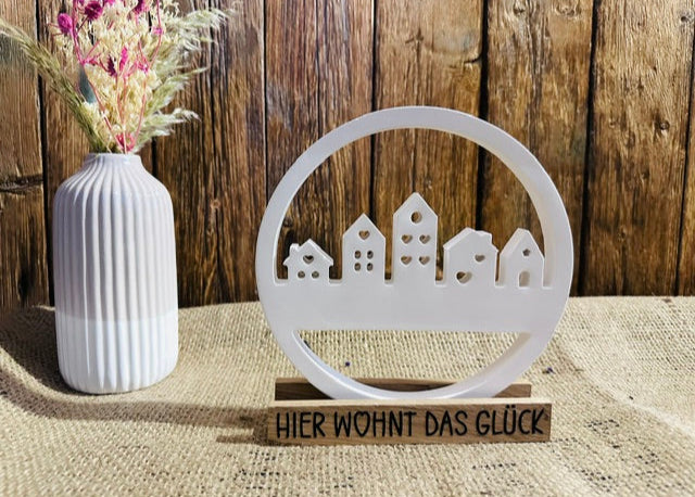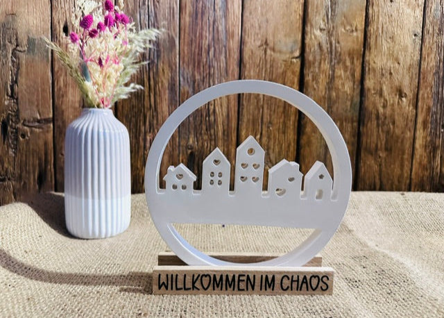 Unser Bastelbanden-Häuserkranz bringt modernen Charme und eine warme Ausstrahlung in dein Zuhause. Der Kranz wird wird mit einem rustikalem Ständer aus Eichenklötzchen und einem Aufdruck deiner Wahl aus schwarzer Vinyl-Folie verziert.