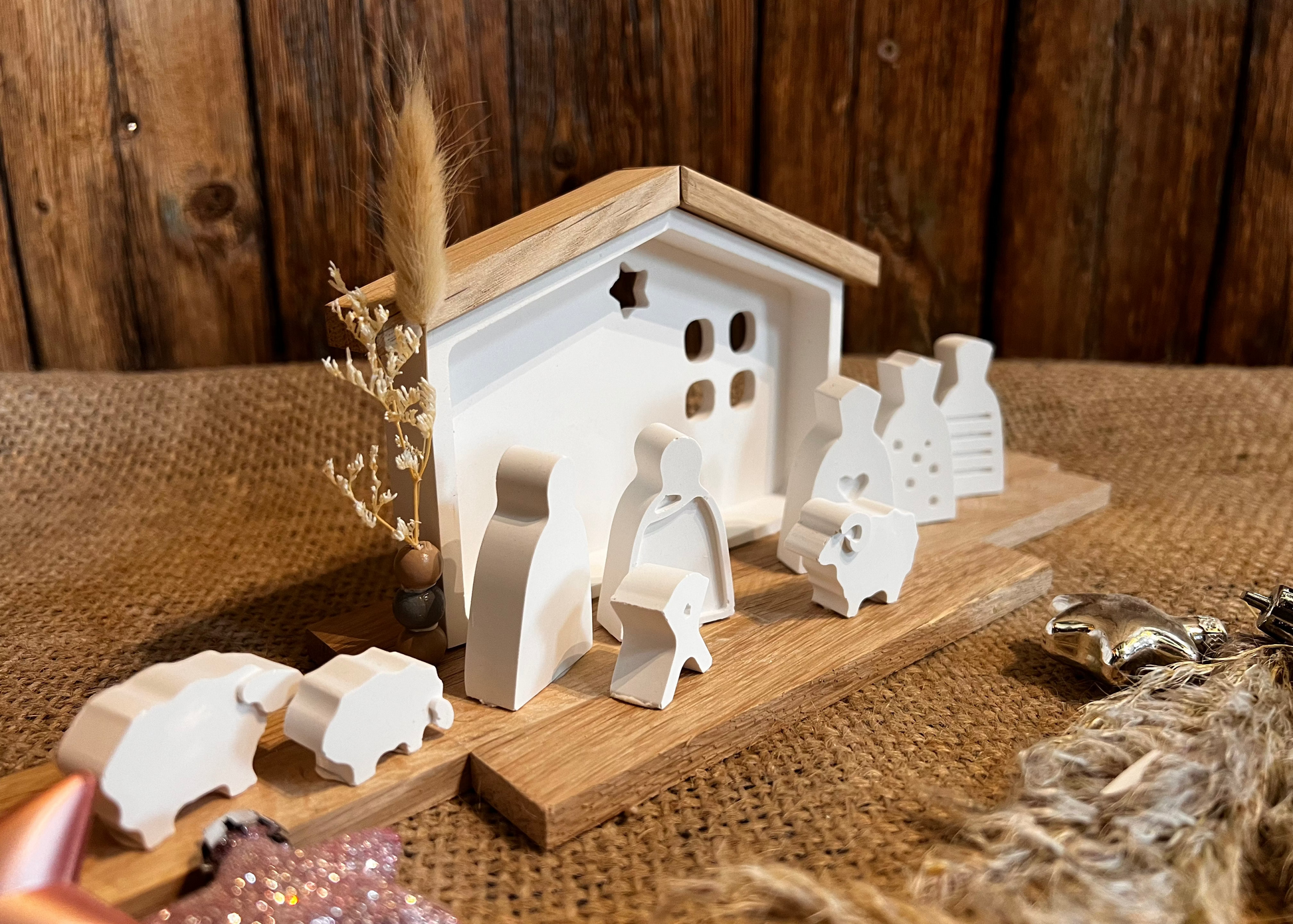 Ein echtes Lieblingsstück aus der Bastelbande-Werkstatt: Eine liebevoll gefertigte Krippe im natürlichen Stil der Bastelbande.