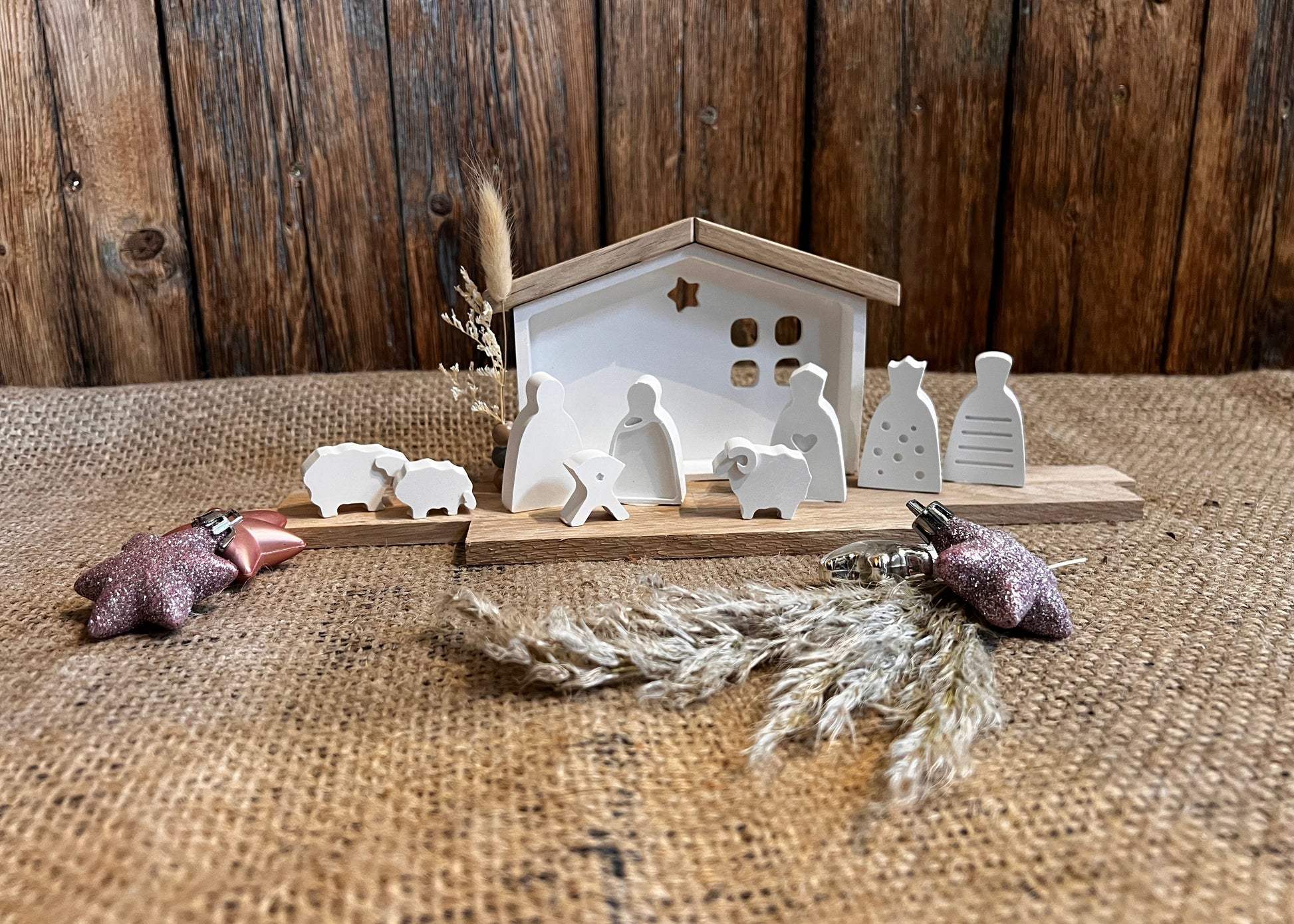 Das passende Tablett aus Eichenklötzchen eignet sich perfekt, um die Krippe dekorativ in Szene zu setzen. Der Stall misst ca. 13 × 19 cm, die menschlichen Figuren sind etwa 7,5 × 2,5 cm groß.