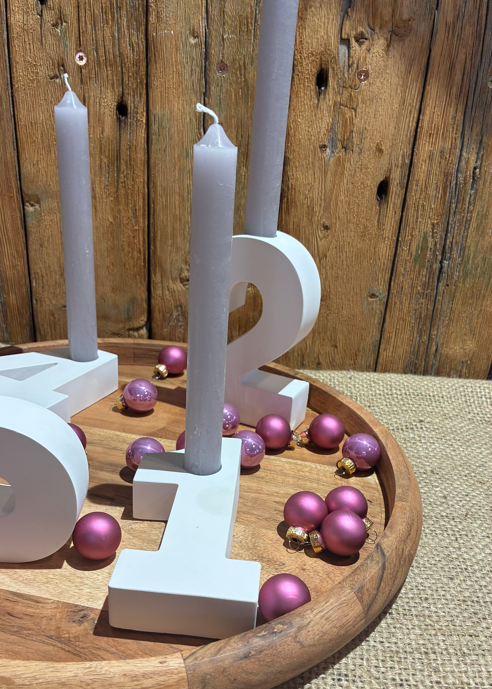 Ein moderner Adventskranz mal anders – schlicht, edel und handgemacht. Das 4-teilige Set mit den Zahlen 1–4 ist perfekt, um die Adventszeit individuell zu gestalten. Jede Zahl dient als Kerzenhalter und lässt sich wunderbar auf einem Tablett, Teller oder direkt auf dem Tisch dekorieren – ganz nach deinem Stil.